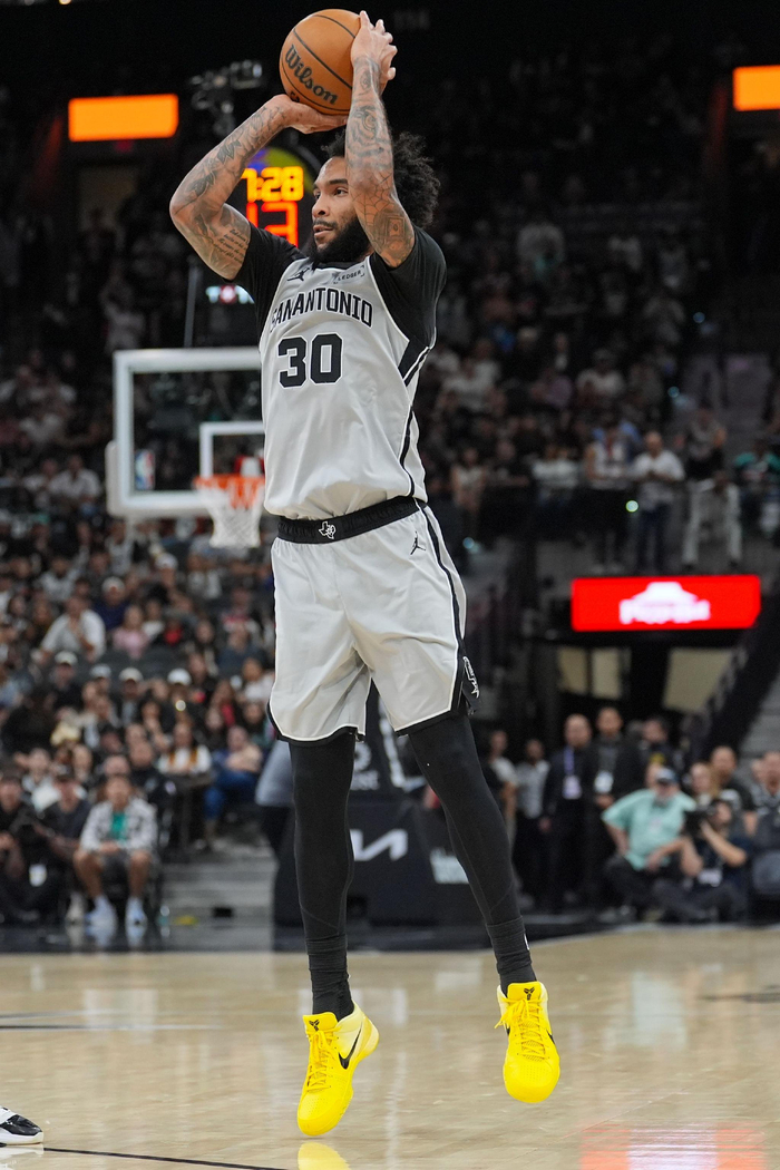谢泼德不仅防守端被针对,进攻端的持球自主进攻戏份也被马刺强壮的摇摆锋卫群压到了最低,上半场非常依赖无球走位接球投射