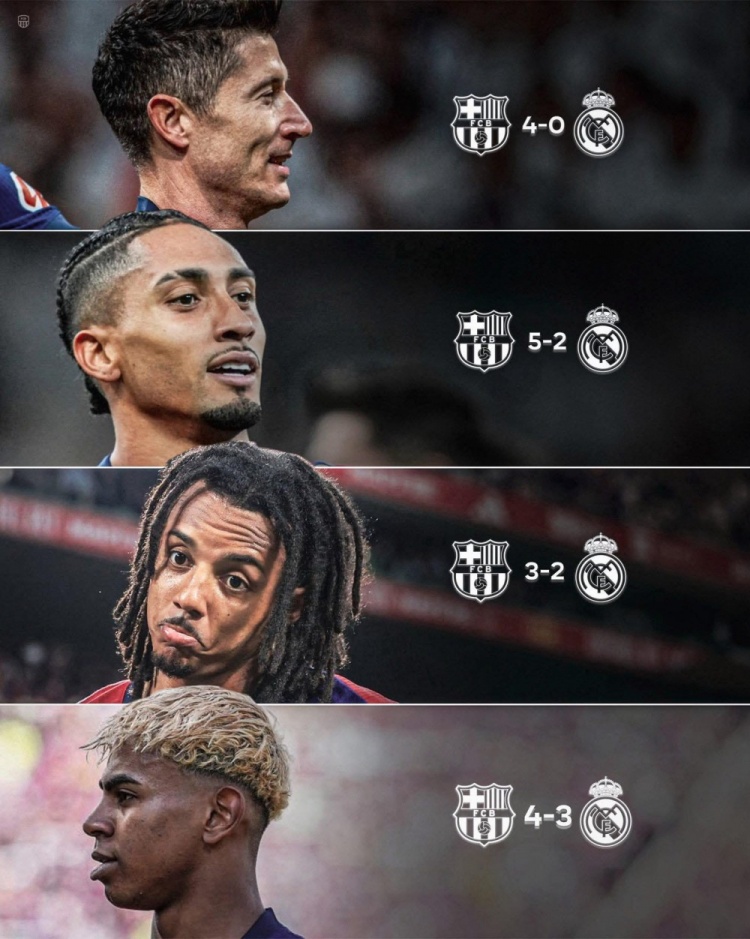 在弗里克接手巴萨前,皇马曾经单赛季连续3次击败红蓝军团。所以当皇马得到姆巴佩后,都以为他们将会延续对巴萨的优势,结果上赛季第一次碰头,皇马在伯纳乌0比4完败。