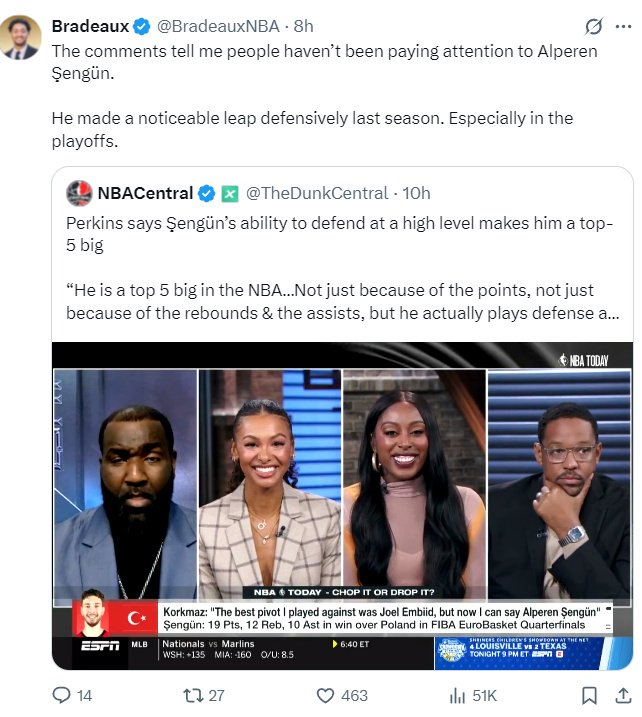 北京时间9月12日,名嘴帕金斯在ESPN的节目中谈到了火箭中锋阿尔佩伦-申京,结合申京上赛季的表现与今夏欧洲杯的表现,帕金斯说道:申京具备高水平的防守能力,这使得他有成为联盟前五中锋之一的潜力。