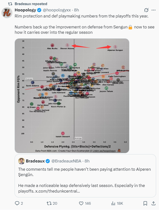 数据媒体Hoopology还制作了上赛季季后赛球员的篮板保护数据与助攻失误比的图表,申京在两项数据中都是佼佼者,申京都领跑联盟。